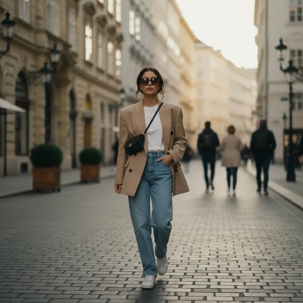 Oversized Blazer in Schwarz, darunter ein weißes Baumwoll-T-Shirt, eine weite Jeans und klobige Loafers. Dazu eine minimalistische Goldkette und eine strukturierte Handtasche. Dieser Look funktioniert vom Brunch bis zum Abendessen und ist eines der am häufigsten fotografierten Outfits auf den Straßen von Mailand und Paris.